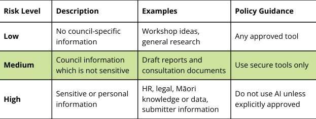 The tools for writing consultation documents use a secure, GDPR-compliant platform suitable for council information that isn’t sensitive or personal, so they are suitable for ‘medium risk’ use (including consultation documents) as shown in the framework I have developed to guide AI use by councils.